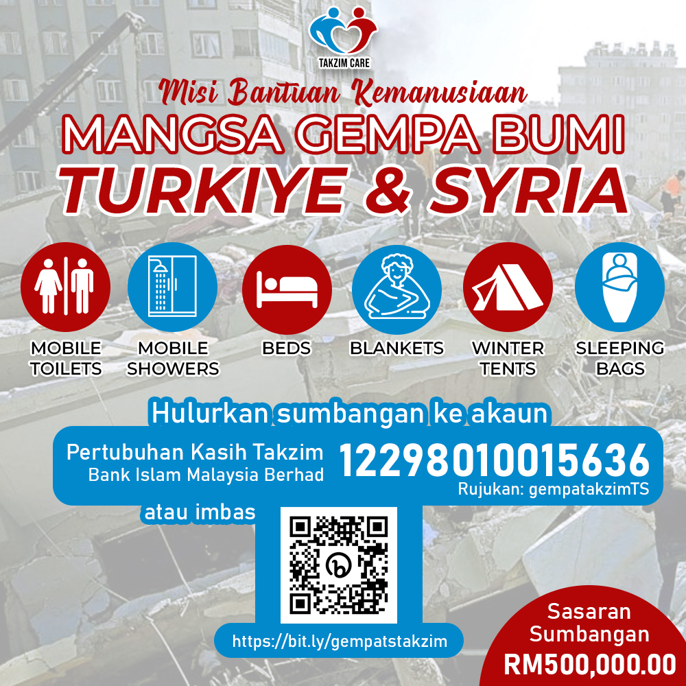 Takzim Care dengan kerjasama beberapa Badan Bukan Kerajaan (NGO) termasuk Yayasan Ummet Vakfi yang berada di Turkiye dan Syria sedang mengumpul dana bagi membantu mangsa yang terkesan dengan musibah gempa bumi yang berlaku baru-baru ini. Sasaran sumbangan sebanyak RM500,000.00 diperlukan untuk membeli barang keperluan asas musim sejuk seperti: